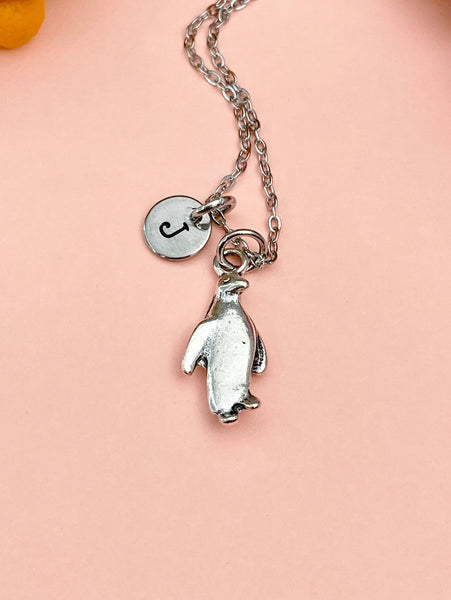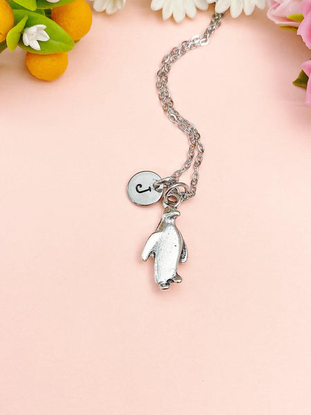 This is silver tone Penguin charm with hand stamped initial charm on brass/stainless steel 18 inches chain