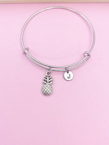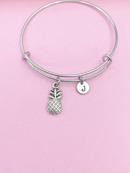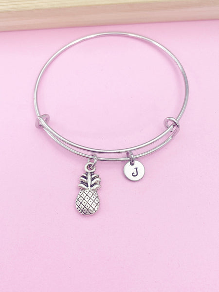 This is a silver-tone pineapple charm with hand stamped initial charm on stainless steel bracelet.