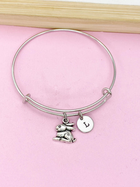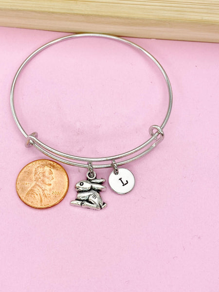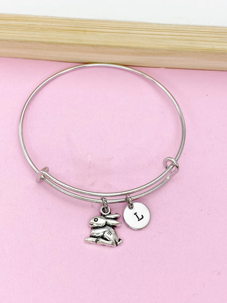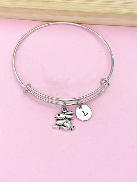 This is a silver-tone rabbit charm with hand stamped initial charm on Tarnish Resistant stainless steel bracelet.