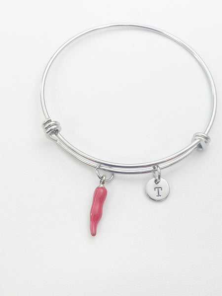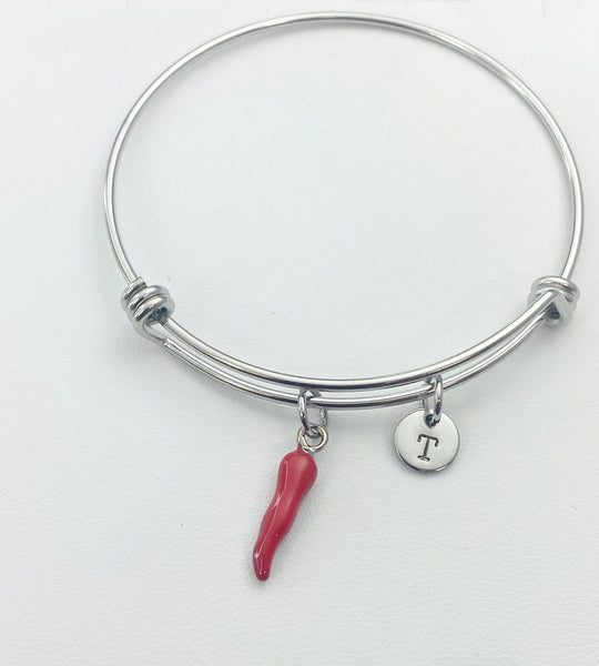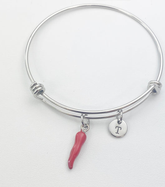 This is a silver-tone red chili charm with hand stamped initial charm on stainless steel bracelet bangle.