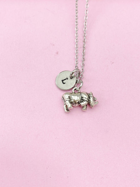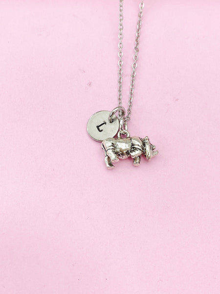 This is a silver-tone Rhinoceros charm with hand stamped initial charm on brass or stainless-steel chain.