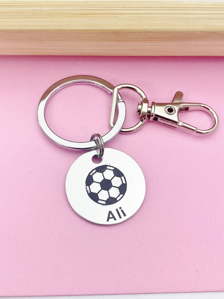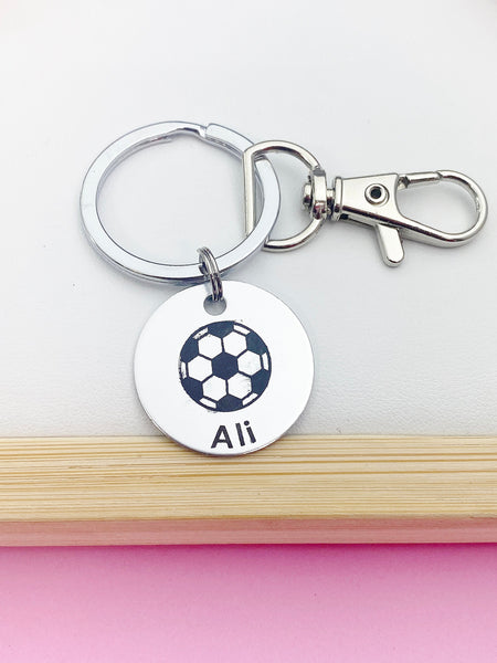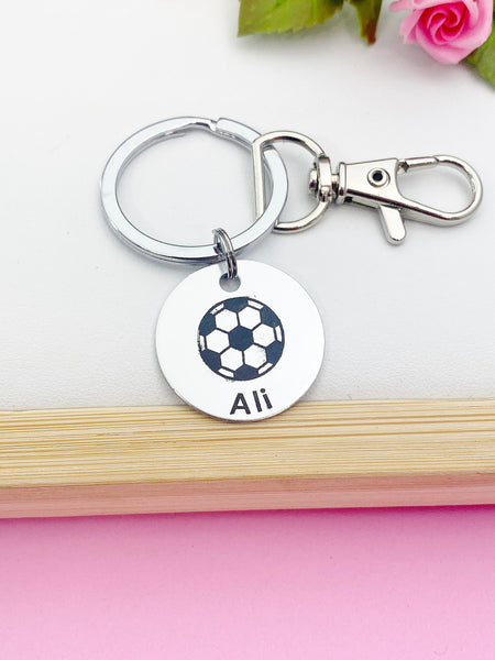 This is an engraving Soccer Ball and Name on aluminum charm on split key ring.