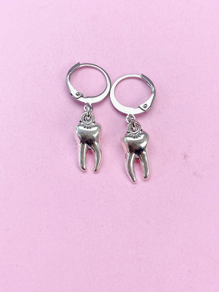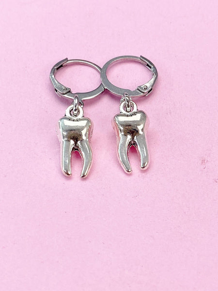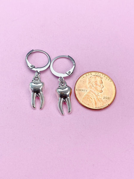 These are silver-toned tooth charms with stainless steel ear hooks.