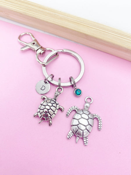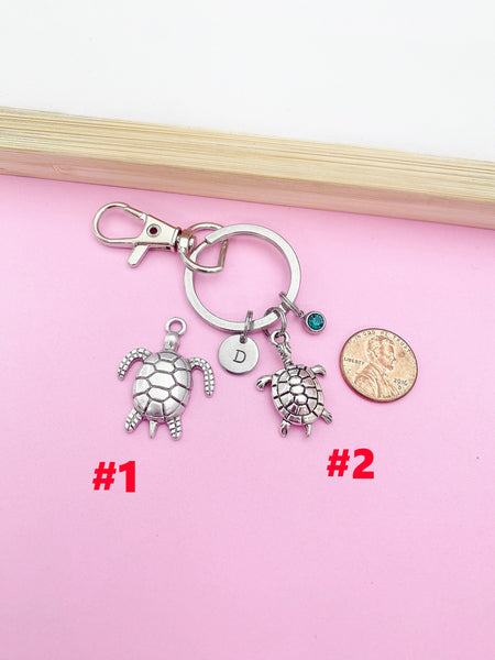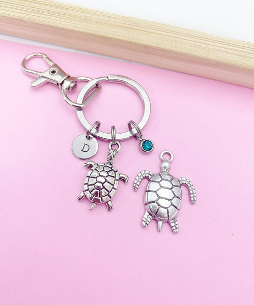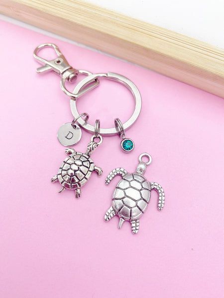 This is a silver tone turtle or sea turtle charm with hand stamped initial charm on keyring.