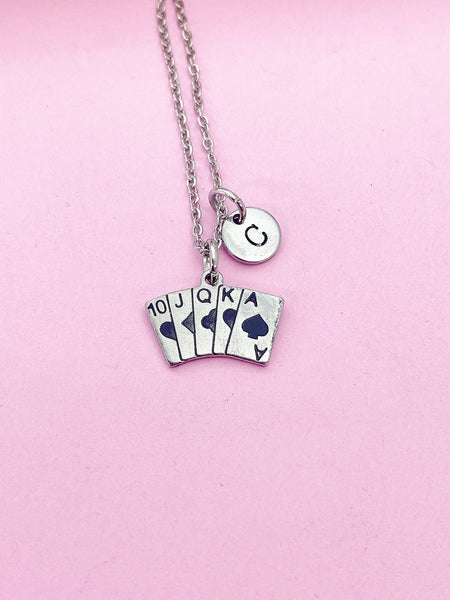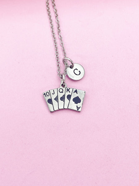 This is stainless-steel play card charm with hand stamped initial charm on stainless-steel chain.