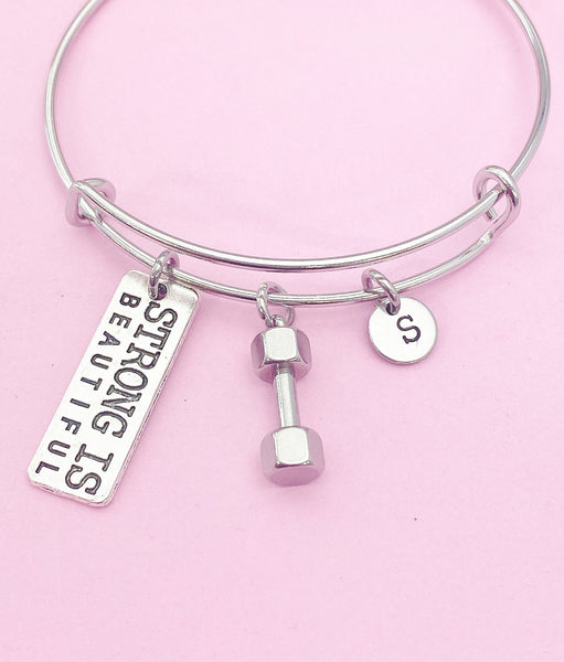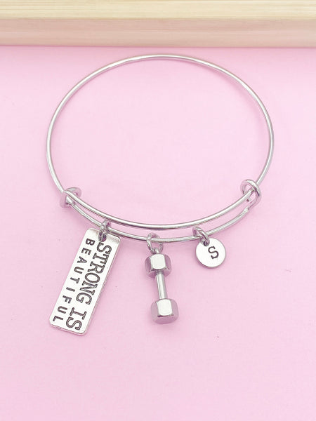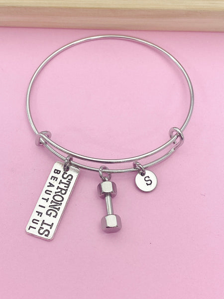 This is a silver-tone strong is beautiful and dumbbell charm with hand stamped initial charm on stainless steel bracelet.