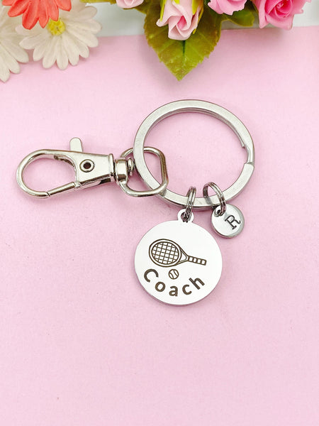 This is an engraving Tennis Coach on stainless-steel with hand stamped initial charm on stainless steel keyring.
