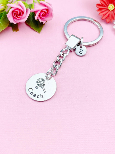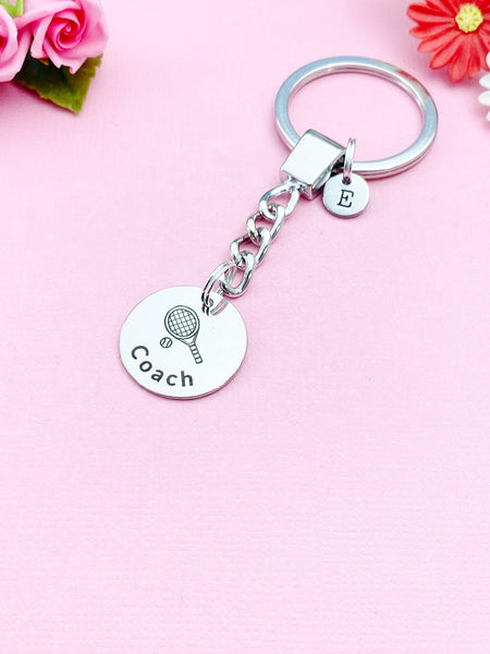 This is an engraving Tennis Coach on stainless-steel with hand stamped initial charm on keyring.