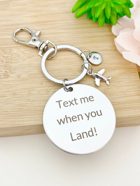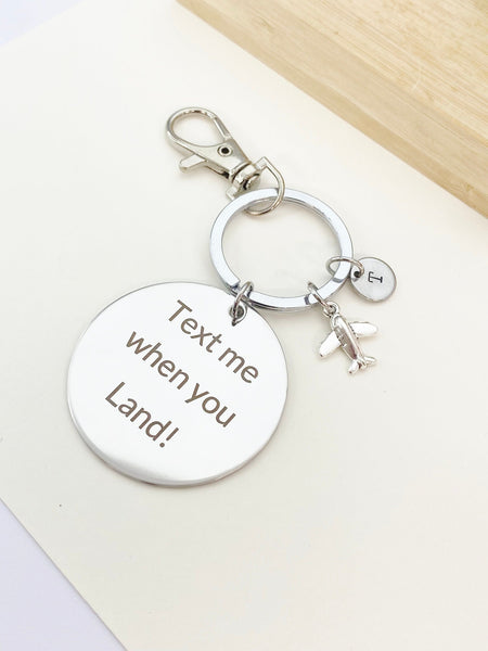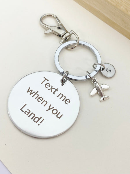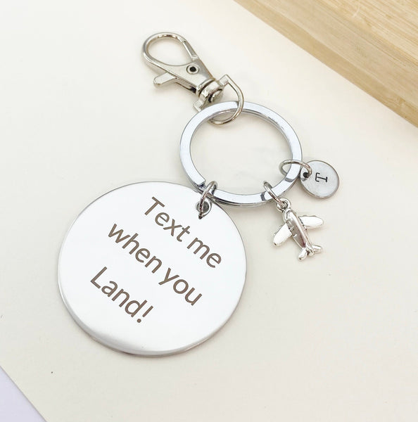 This is an engraving Text Me When You Land on stainless-steel with hand stamped initial charm on keyring.