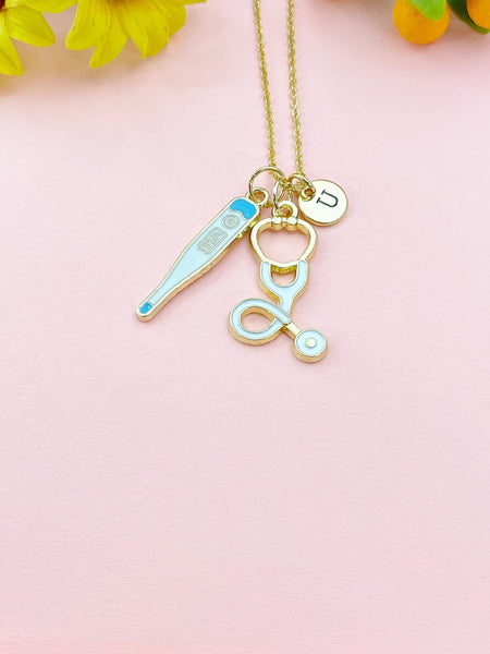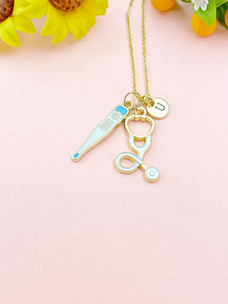 This is a gold -tone Thermometer Stethoscope charm with hand stamped initial charm on brass/stainless steel 18 inches chain or bracelet or keyring.