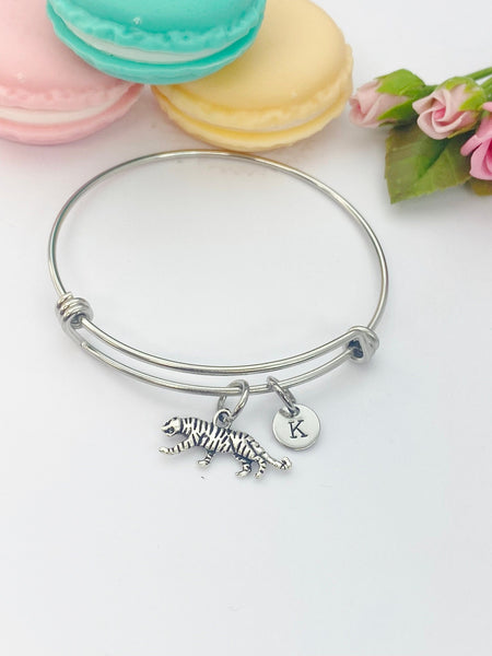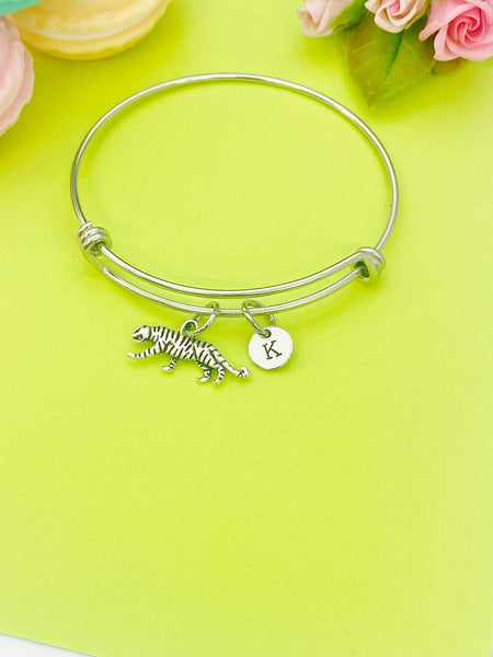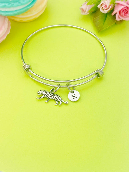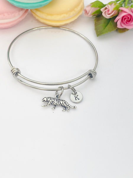 This is a silver-tone tiger charm with hand stamped initial charm on 18 inches chain or bangle.