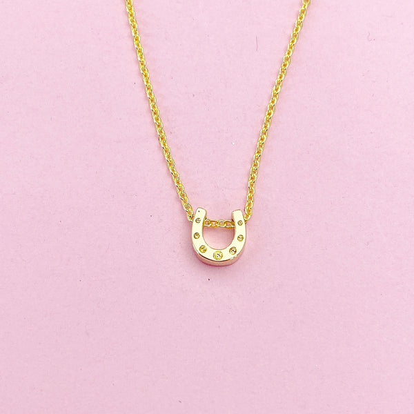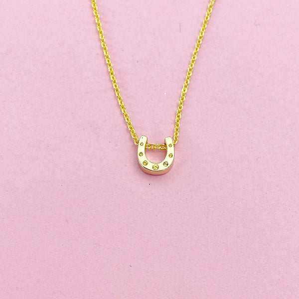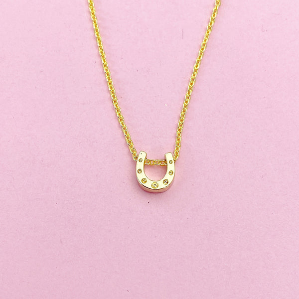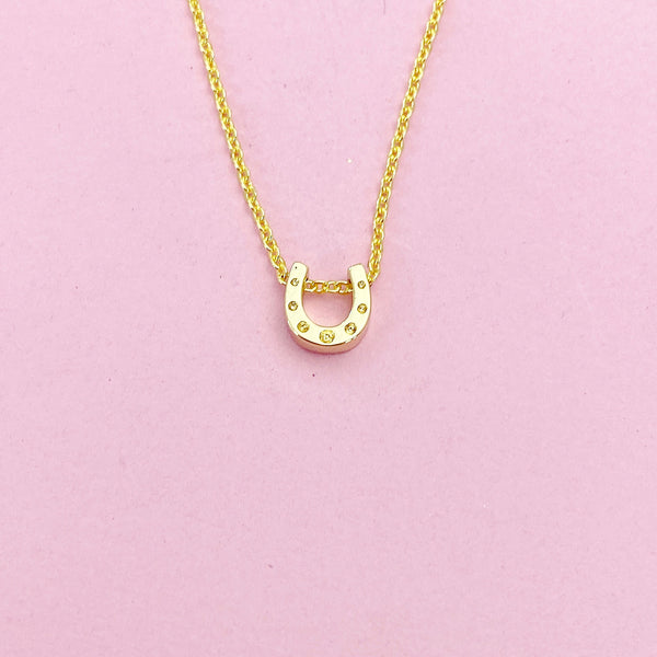 This is gold tone horseshoe charm on brass or stainless-steel chain.