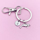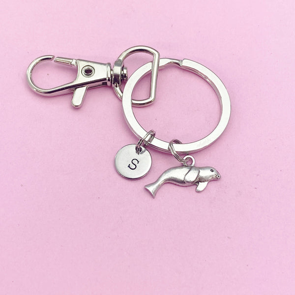 This is a gold or silver-tone seal charm with hand stamped initial charm on keyring.