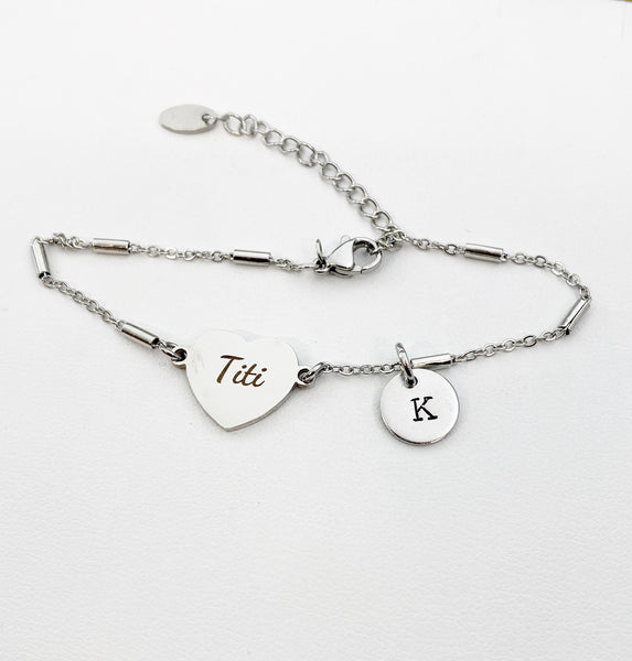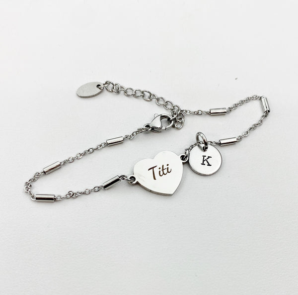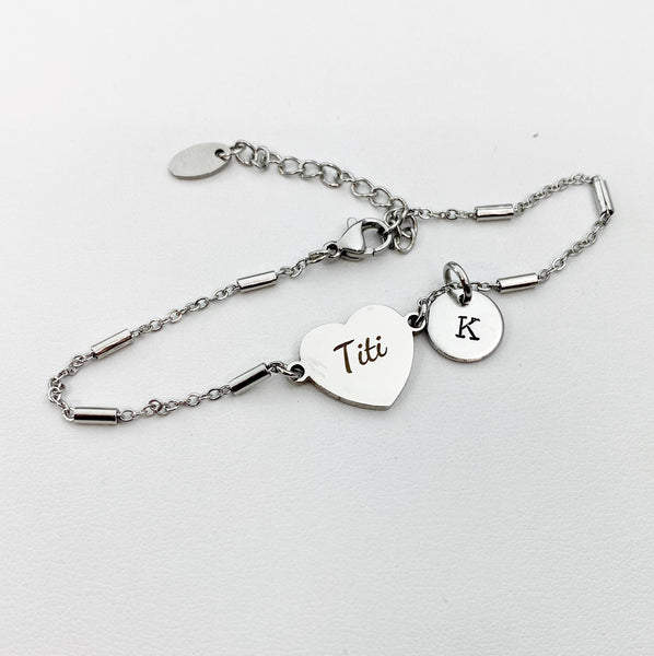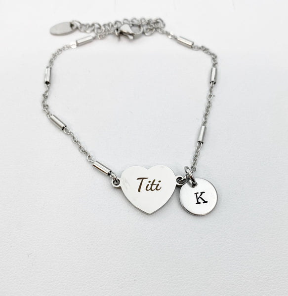 This is an engraving Titi on stainless steel with hand stamp Initial charm on stainless-steel bracelet.