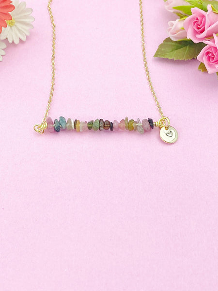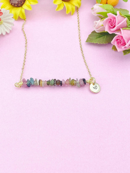 This is natural Tourmaline bar with hand stamped initial charm on brass or stainless steel chain.