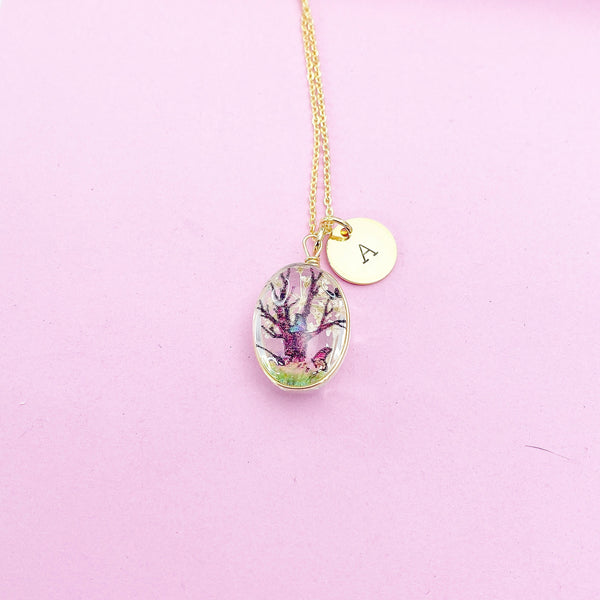 This is gold tone tree charm with hand stamped initial charm on brass or stainless-steel chain.