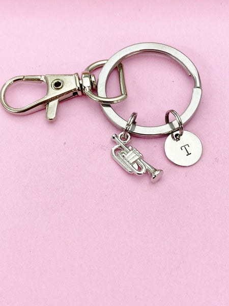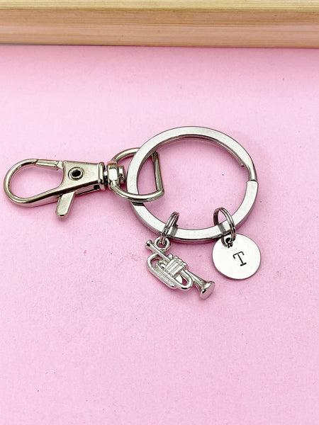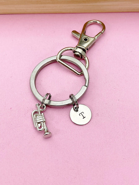 This is silver-tone trumpet charm with hand stamped initial charm on keyring.