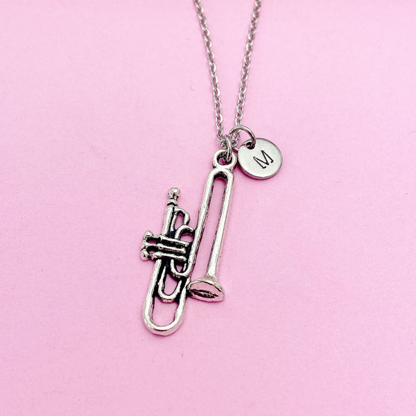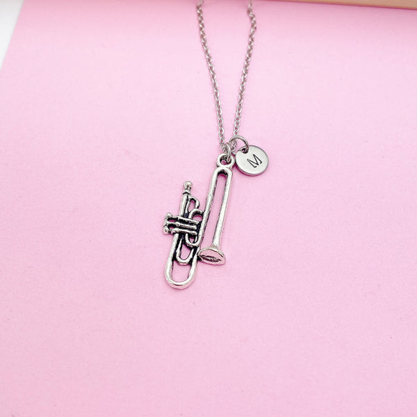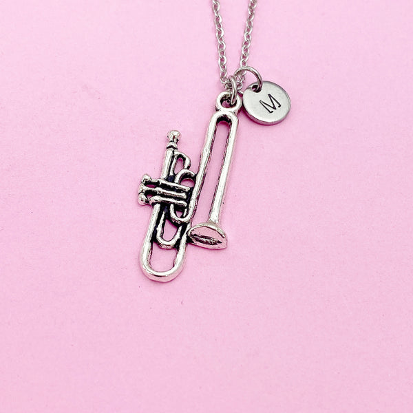 This is a silver-tone Trombone charm with hand stamped initial charm on necklace.