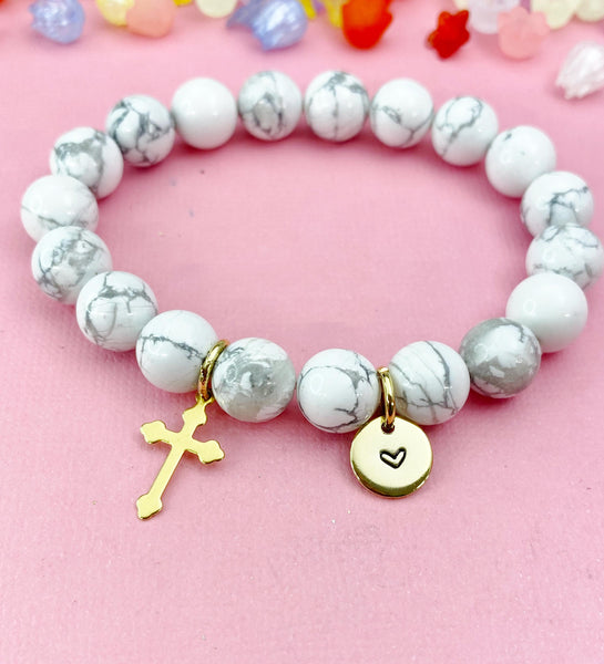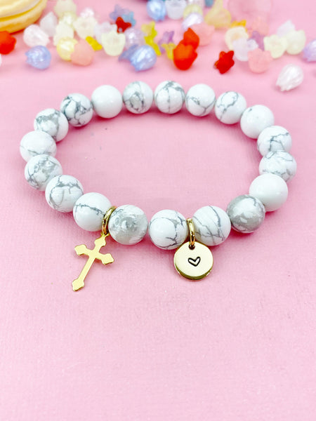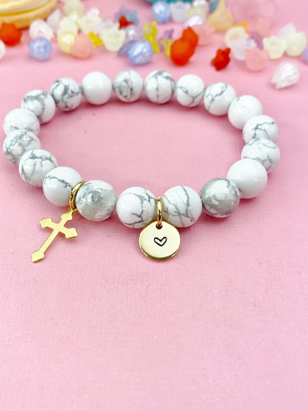 This is a gold or silver tone Synthetic Turquoise with cross and hand stamped initial charm on stretch bracelet.
