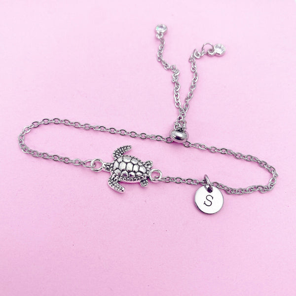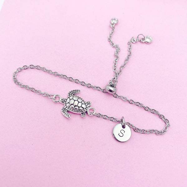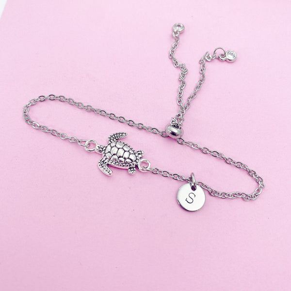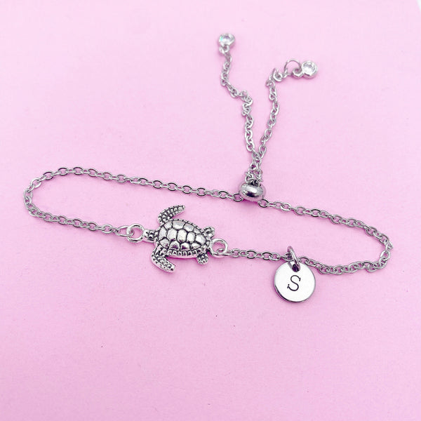 This is a silver-tone Turtle with hand stamped initial charm on stainless steel chain.