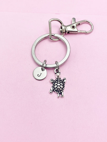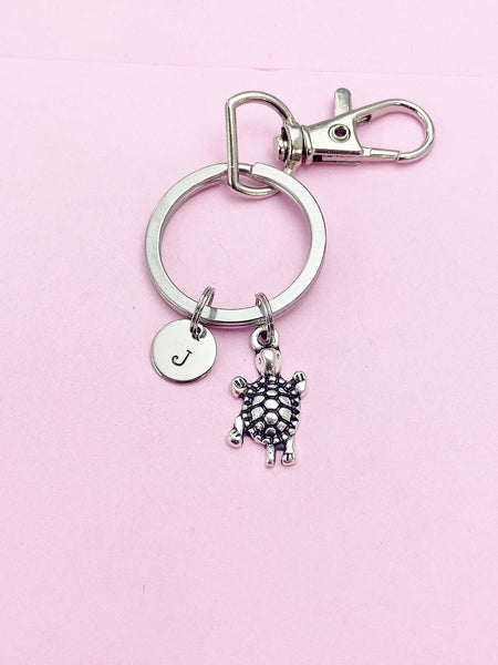 This is a silver-tone Turtle charm with hand stamped initial charm on keyring.