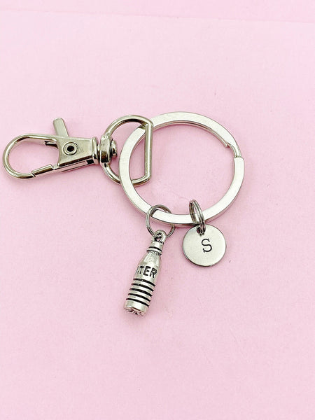 This is a silver-tone Water Bottle charm with hand stamped initial charm on keyring.