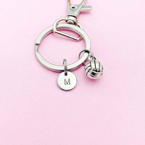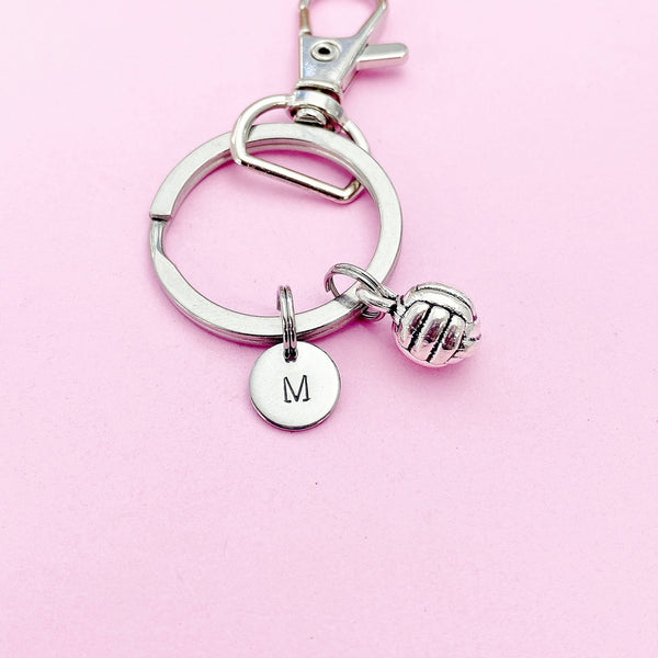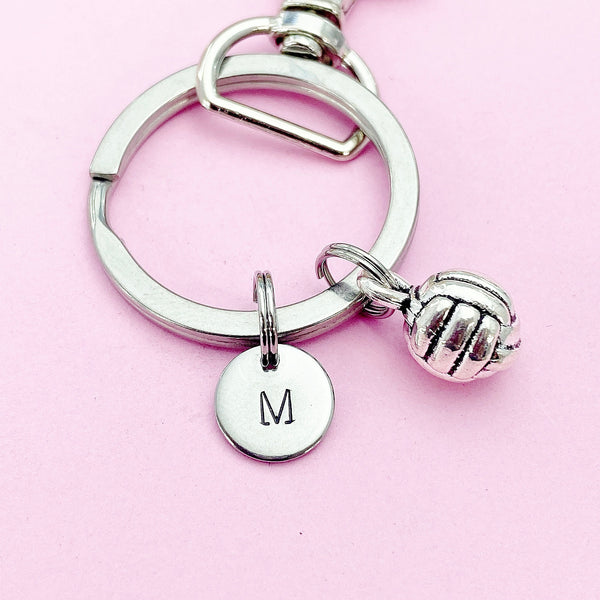 This is a silver-tone Volleyball charm with hand stamped initial charm on keyring.