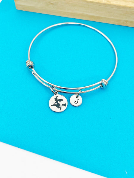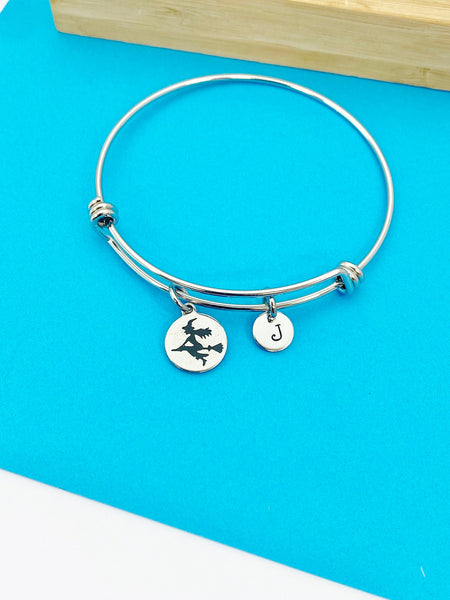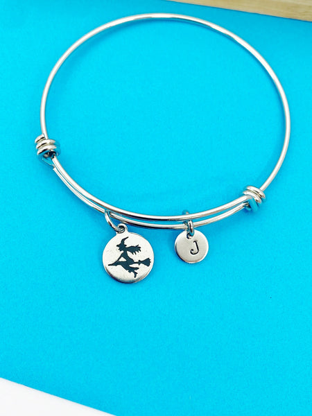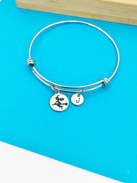 This is a stainless stee witch riding broom charm with hand stamped initial charm on stainless steel bracelet.